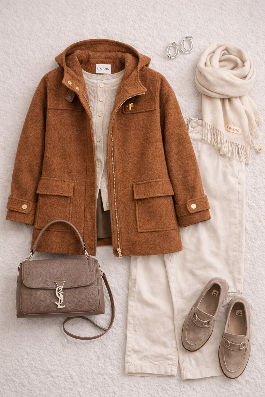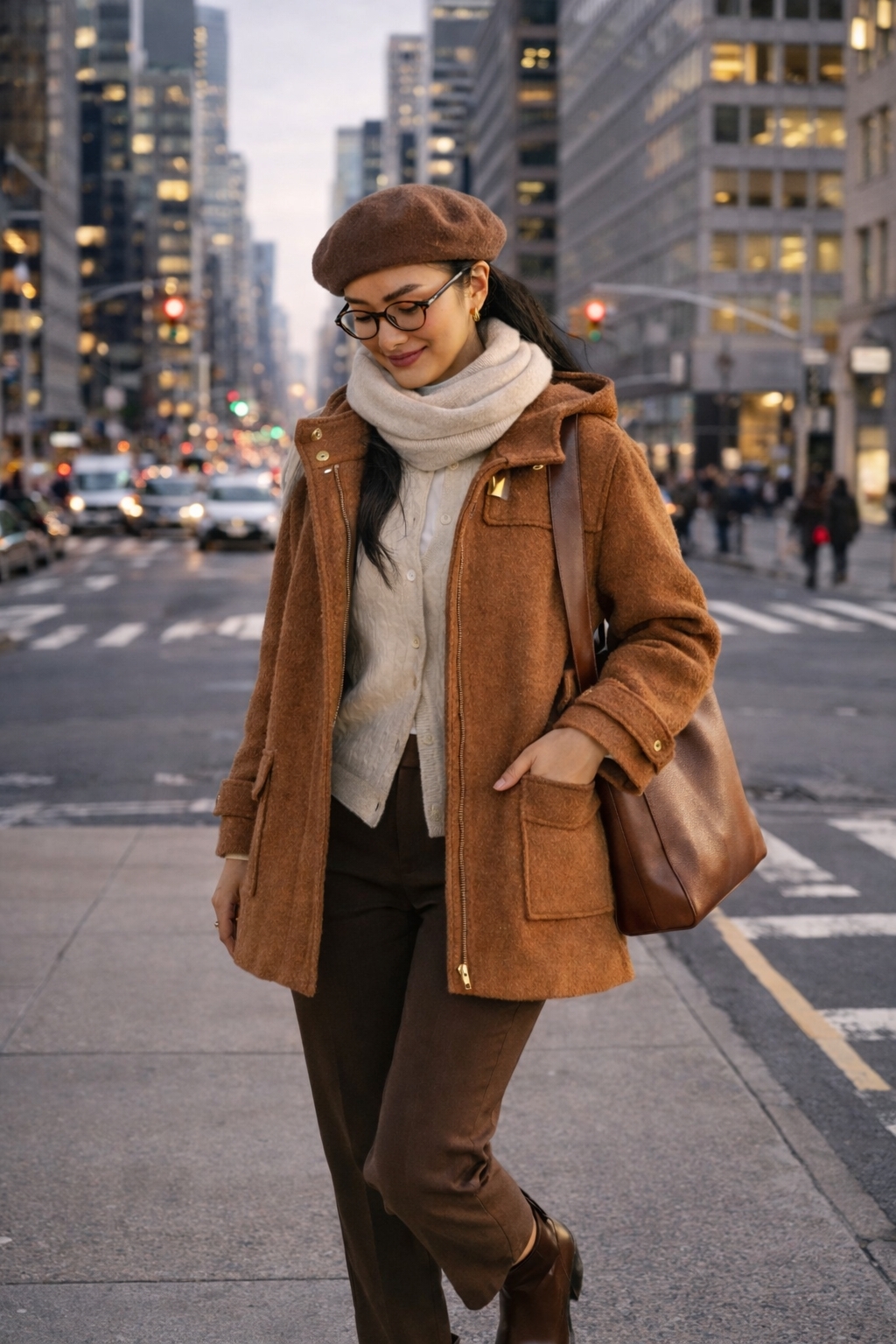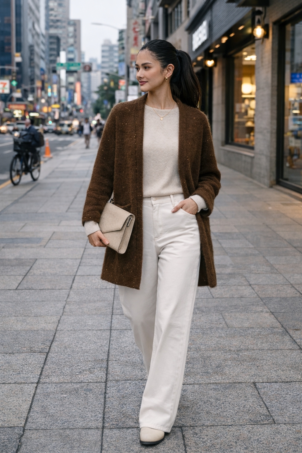 焦糖色帶來一種溫暖柔和的秋冬氛圍,既保有秋冬質感,也不失溫柔優雅。這種暖色大衣是約會或下午茶造型的理想選擇。俐落的剪裁與簡潔線條,讓整體造型散發出知性與從容感,無論是日常通勤或休閒場合,都能輕鬆展現成熟優雅的風格。內搭可以選擇奶茶色針織衫或白色棉質高領,再搭配窄管牛仔褲或裙裝,讓整體層次更柔和而不厚重。