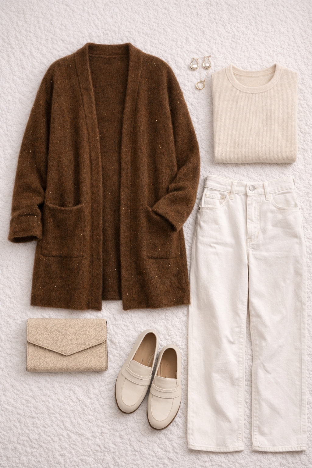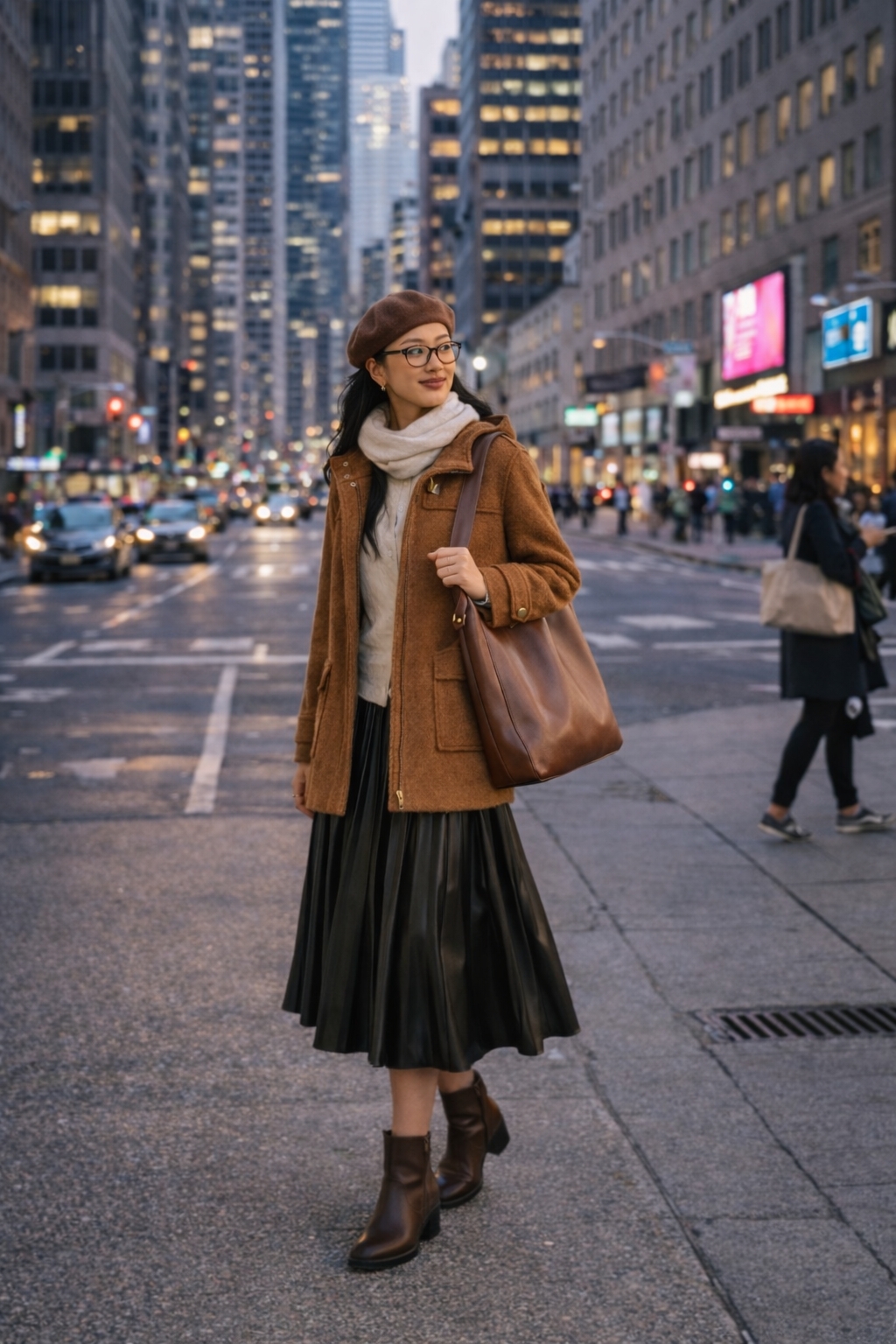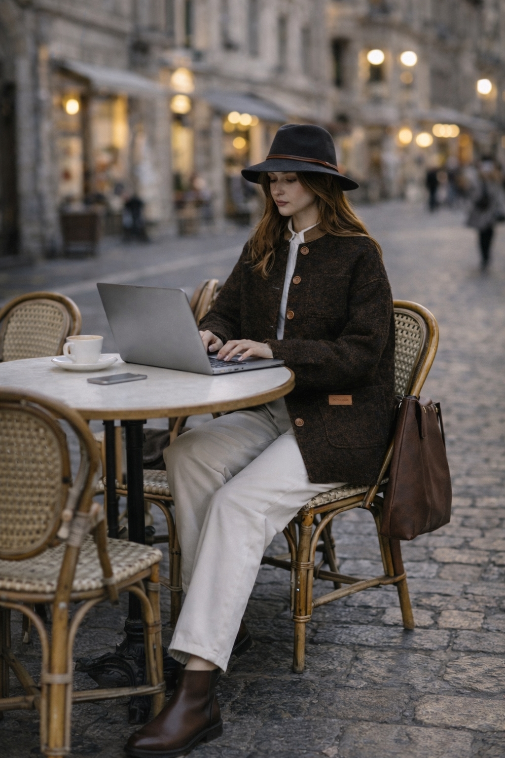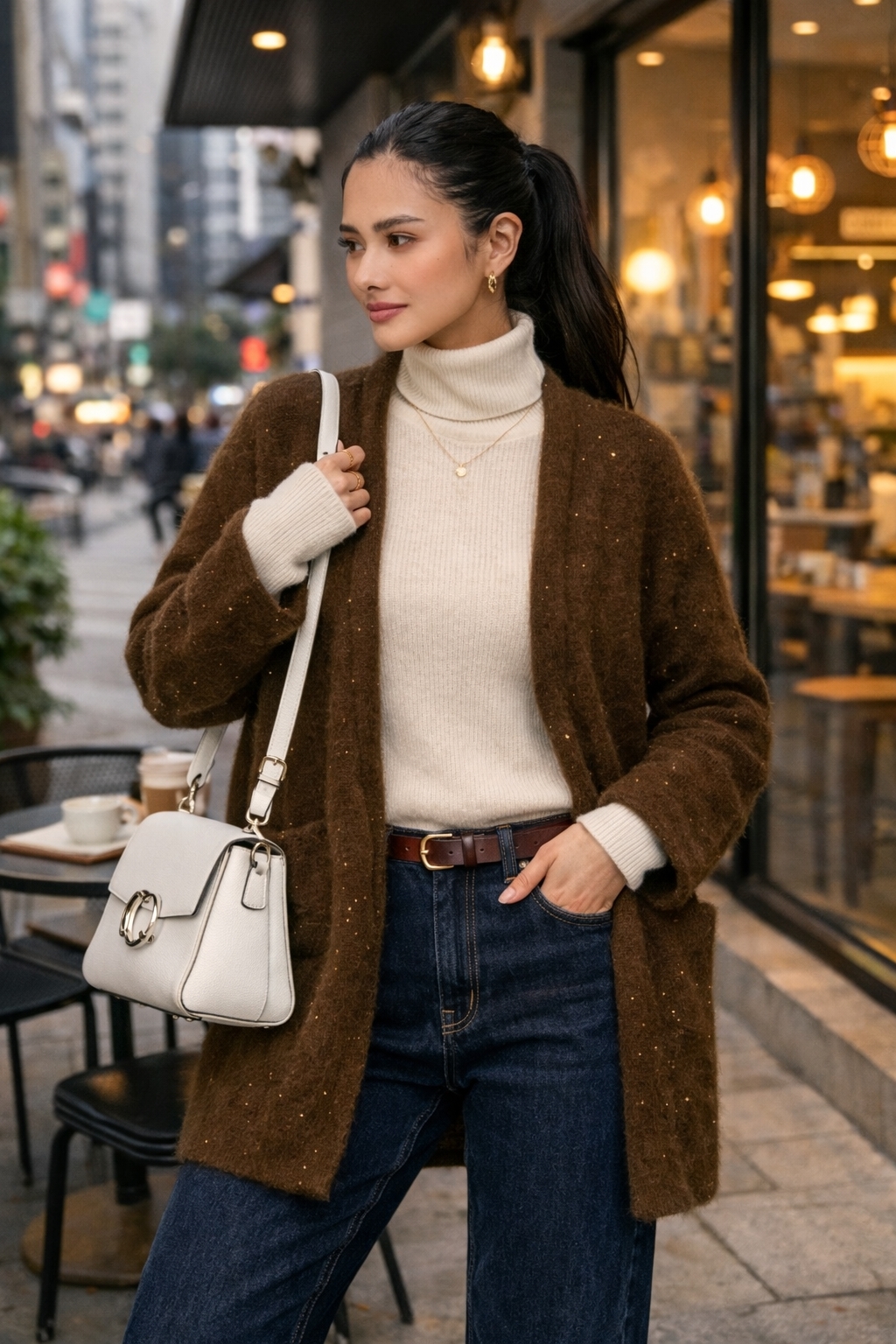 焦糖色帶來一種溫暖柔和的秋冬氛圍,既保有秋冬質感,也不失溫柔優雅。這種暖色大衣是約會或下午茶造型的理想選擇。俐落的剪裁與簡潔線條,讓整體造型散發出知性與從容感,無論是日常通勤或休閒場合,都能輕鬆展現成熟優雅的風格。內搭可以選擇奶茶色針織衫或白色棉質高領,再搭配窄管牛仔褲或裙裝,讓整體層次更柔和而不厚重。