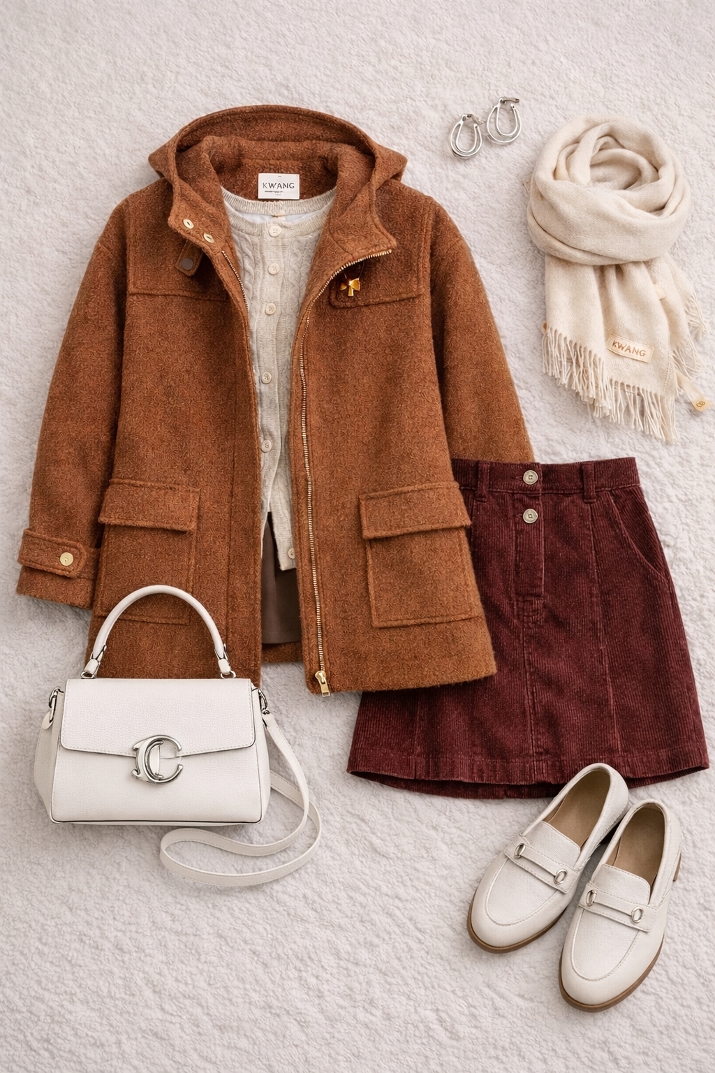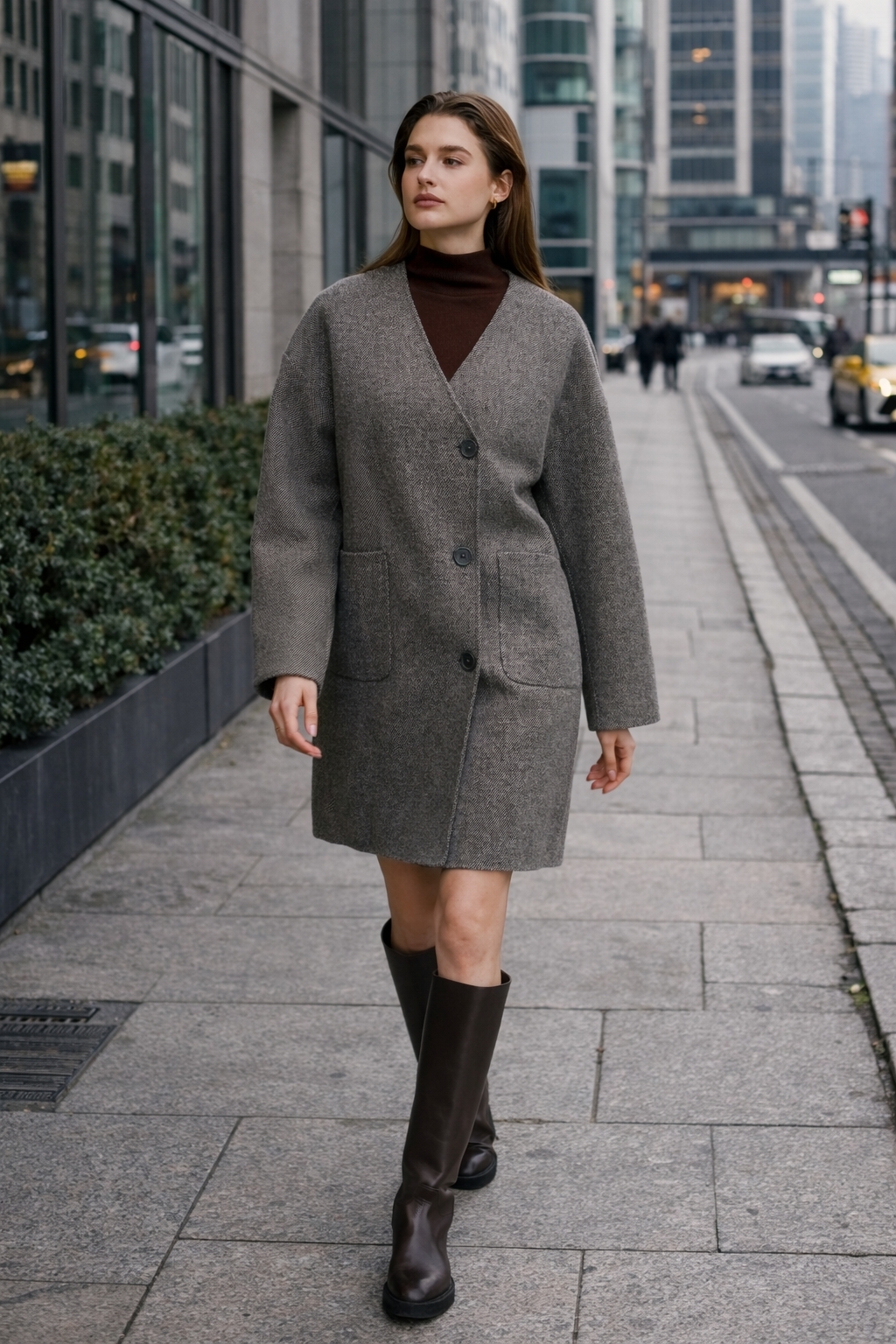 這款外套以 棕綠雙色撞色設計 打破單色大衣的沉悶感,在沉穩色調中加入層次變化,呈現低調卻不失特色的冬季風格。柔軟的材質與俐落版型,讓整體造型更顯質感與從容氣息。週末出遊時,可搭配基本款牛仔褲與毛衣或針織上衣,輕鬆打造簡約卻有個性的日常穿搭。由於大衣本身已具視覺焦點,搭配上選擇簡單的大地色系或中性色單品即可,展現自然又有品味的冬日造型。