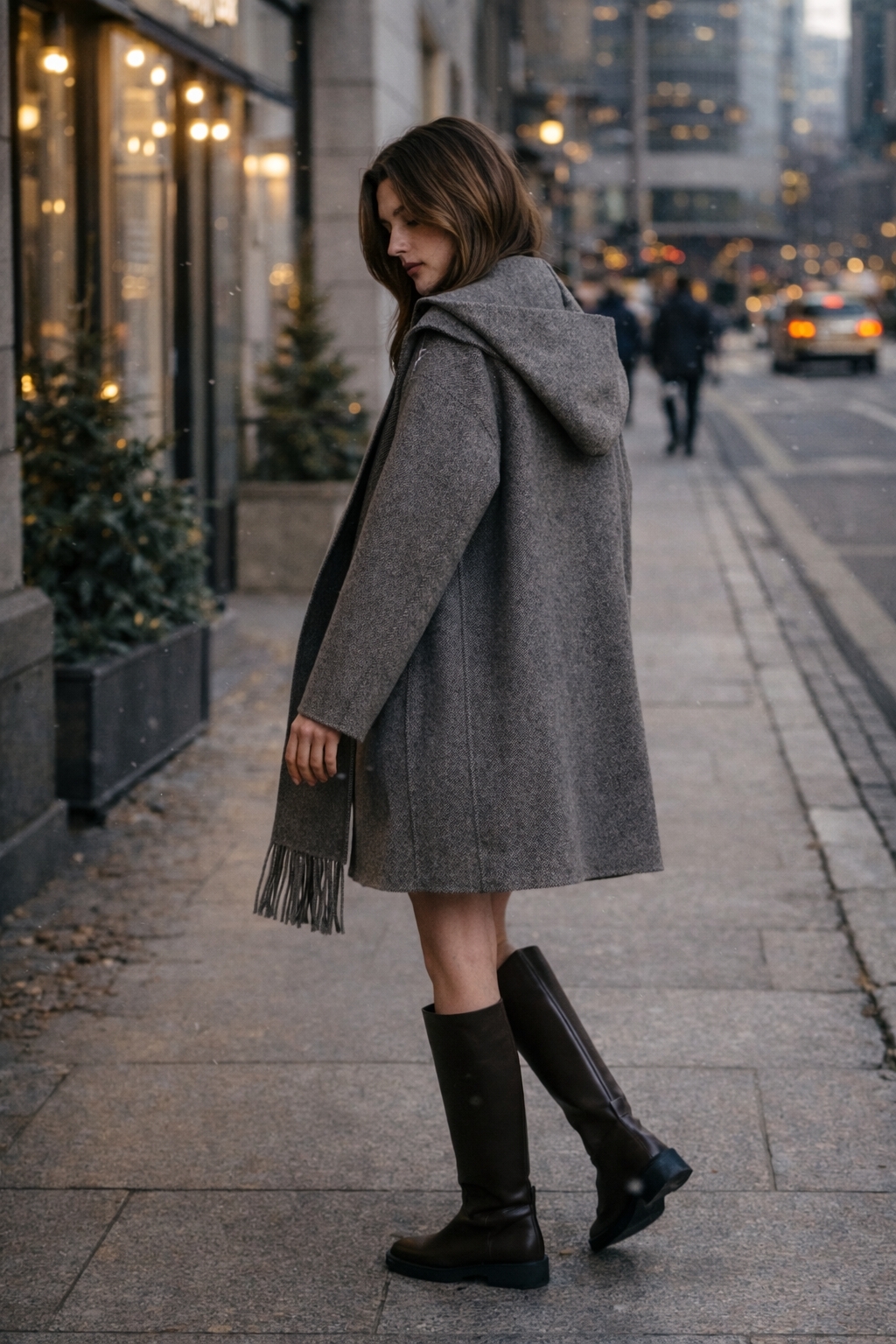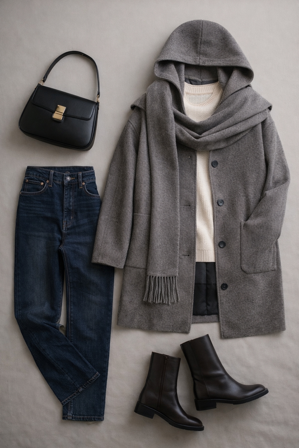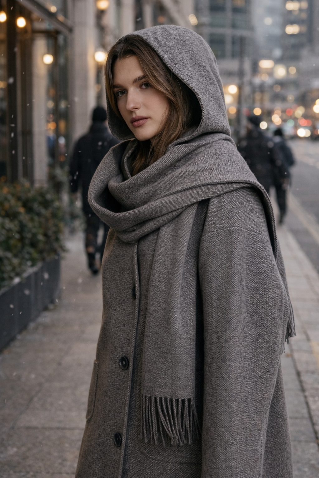 它的魅力不只在於簡約。設計上附有 可拆式連帽圍巾,當圍巾加入時,整件大衣的氣場立刻改變。原本簡潔的輪廓多了一層立體量感,頸部線條被柔軟包覆,造型也更具存在感。這種「兩穿設計」,讓一件外套能在不同場合自由轉換:平日通勤時保持俐落簡潔,週末外出或旅行時則多了份溫暖與風格層次。