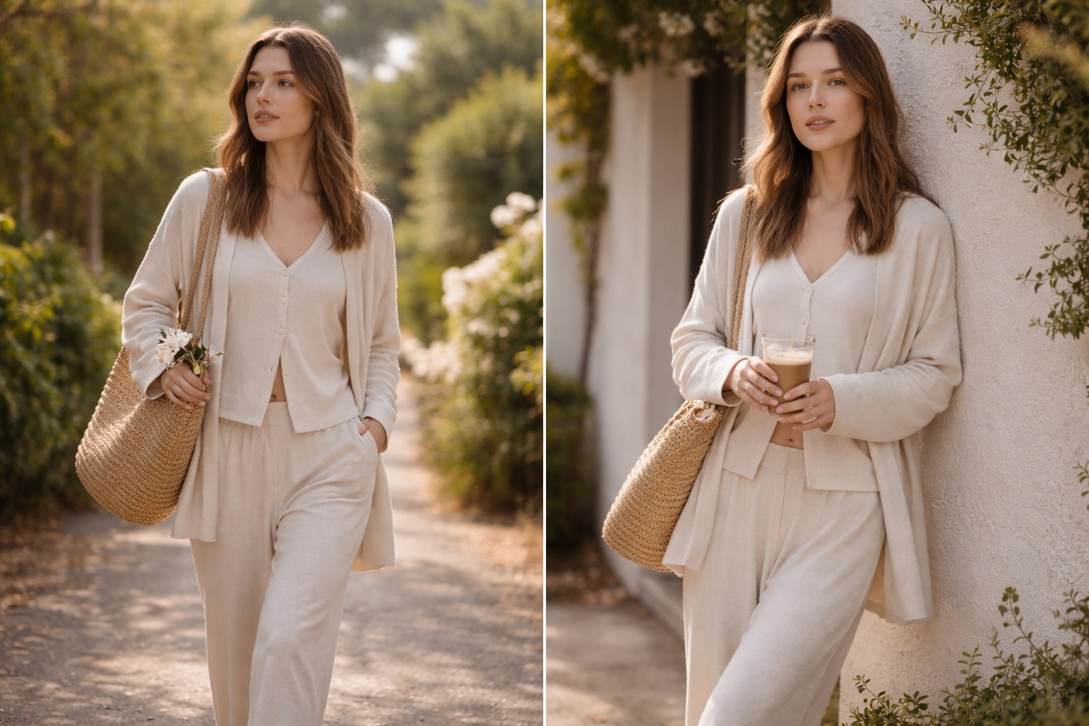 午後的陽光灑在街角,針織套裝搭配簡單的開衫, 柔軟針織自然垂落,三件式的層次讓穿搭不需要費心安排,疊出自然的層次感。