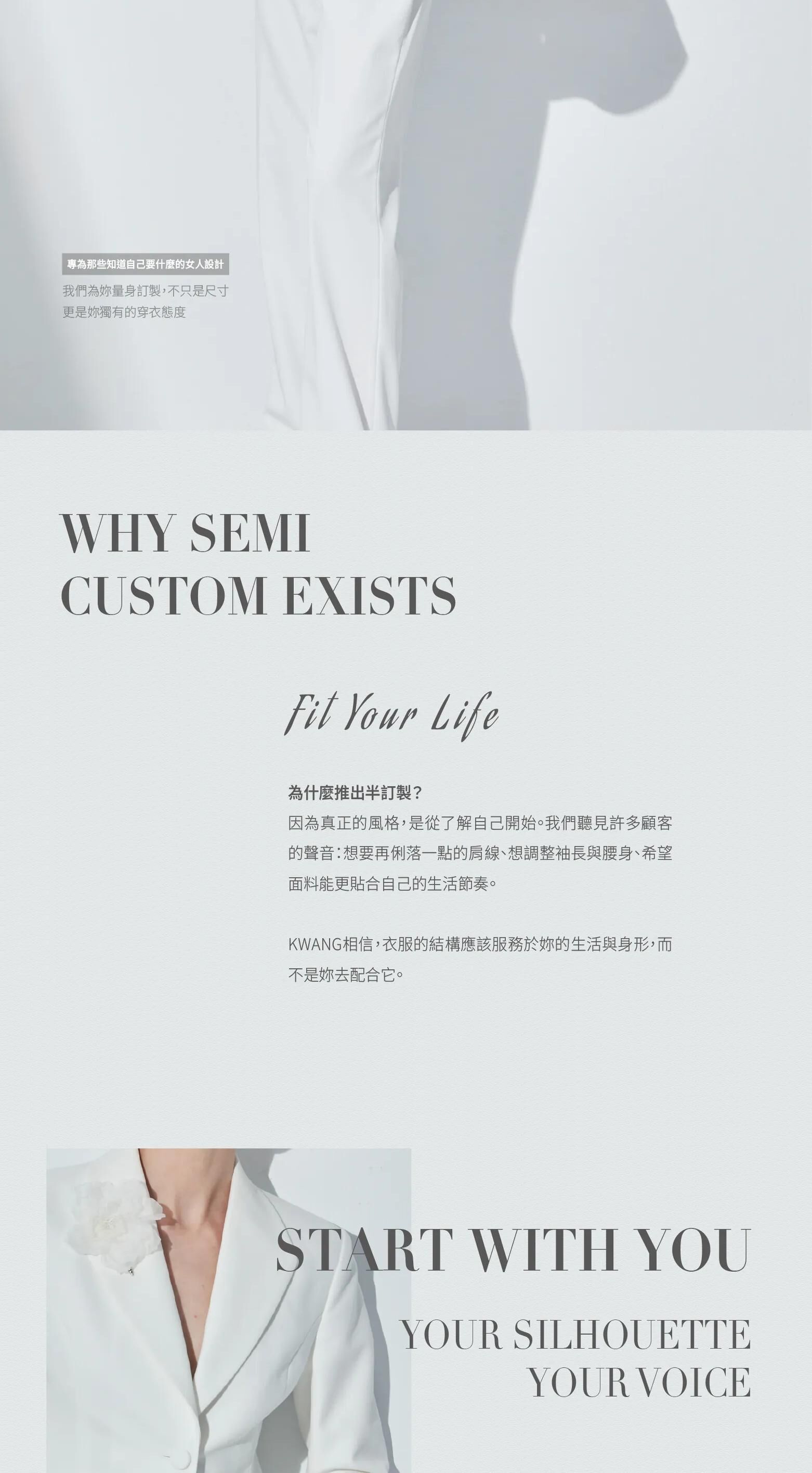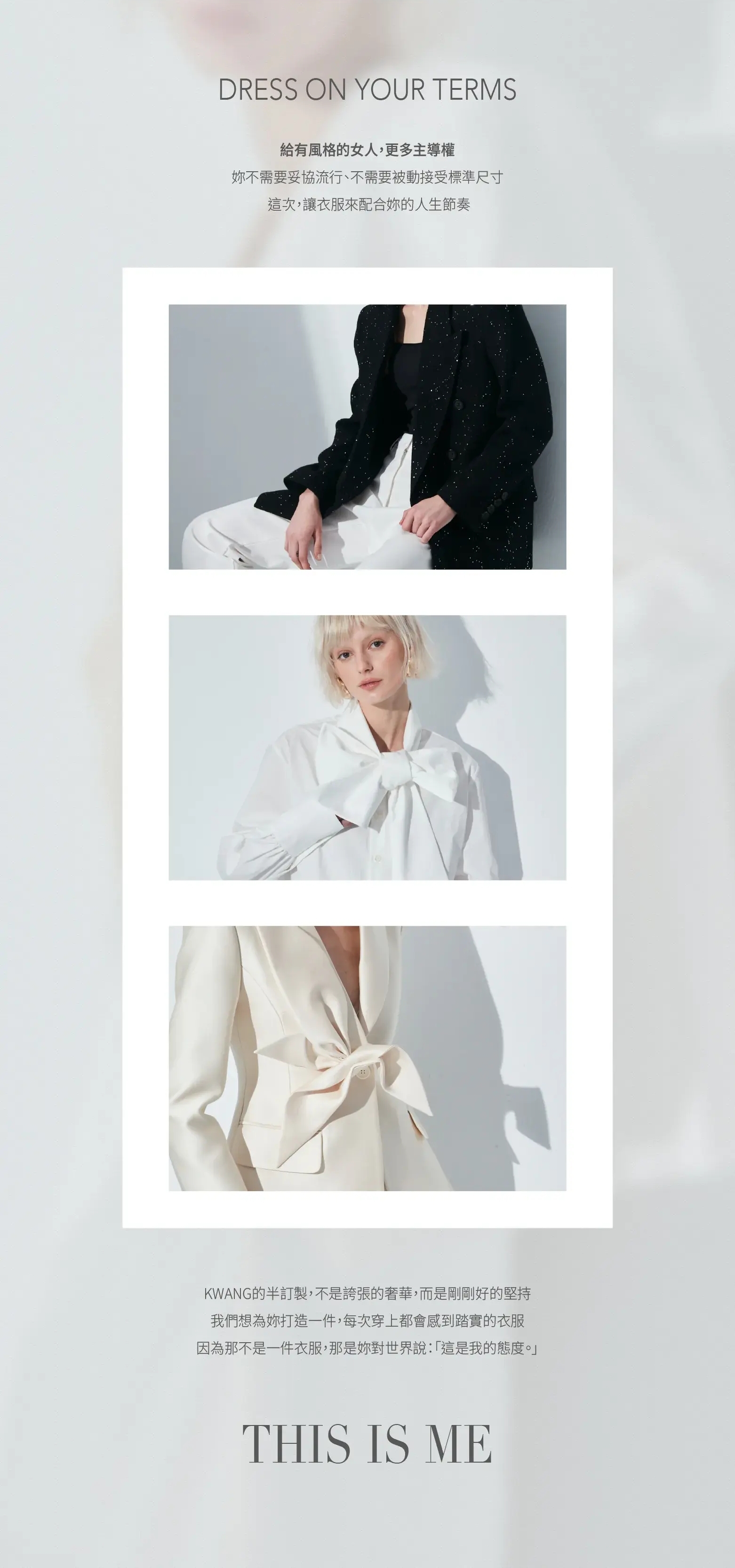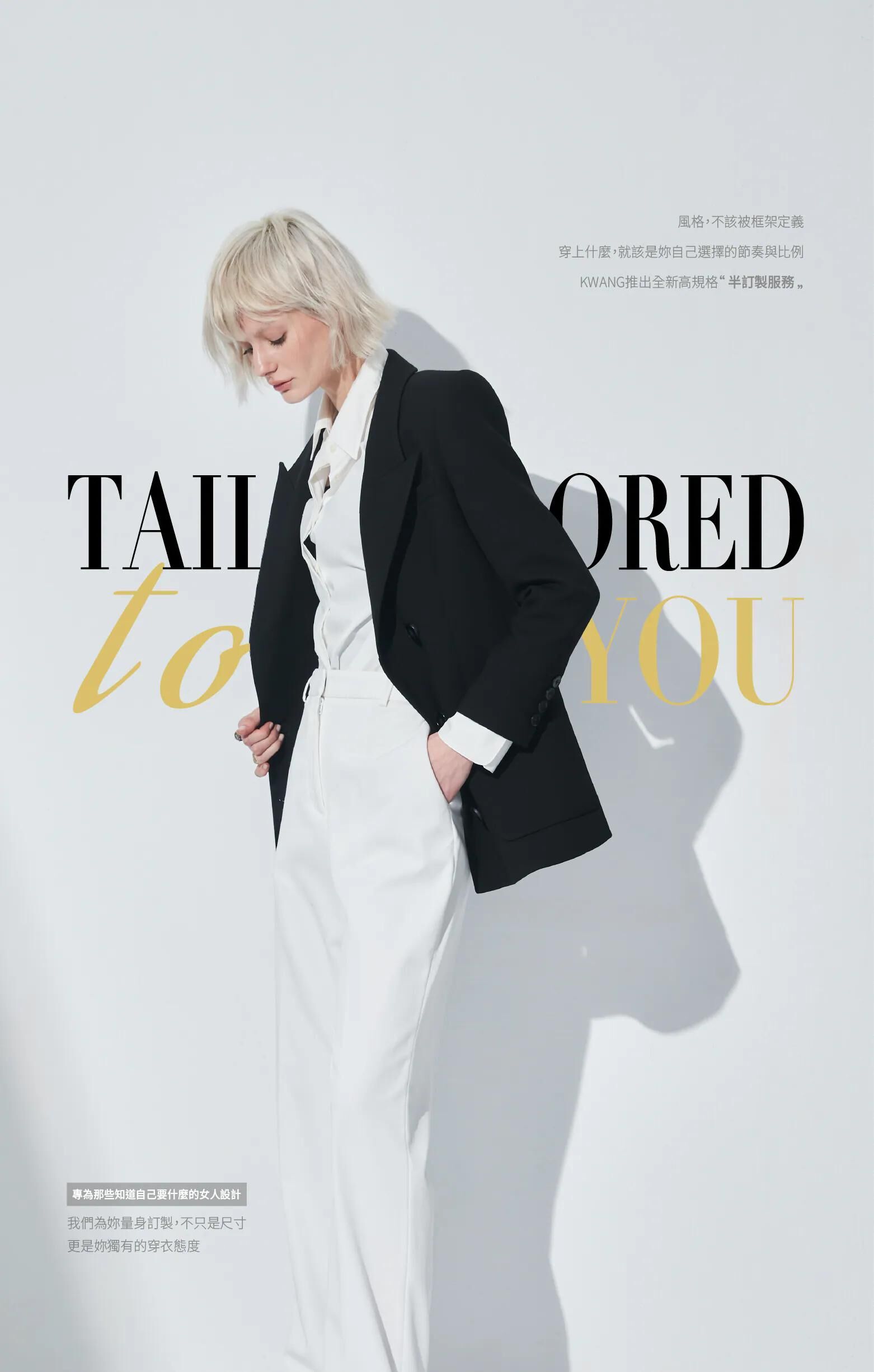 KWANG的微訂製,不是誇張的奢華,而是剛剛好的堅持我們想為妳打造一件,每次穿上都會感到踏實的衣服因為那不是一件衣服,那是妳對世界說:「這是我的態度。」