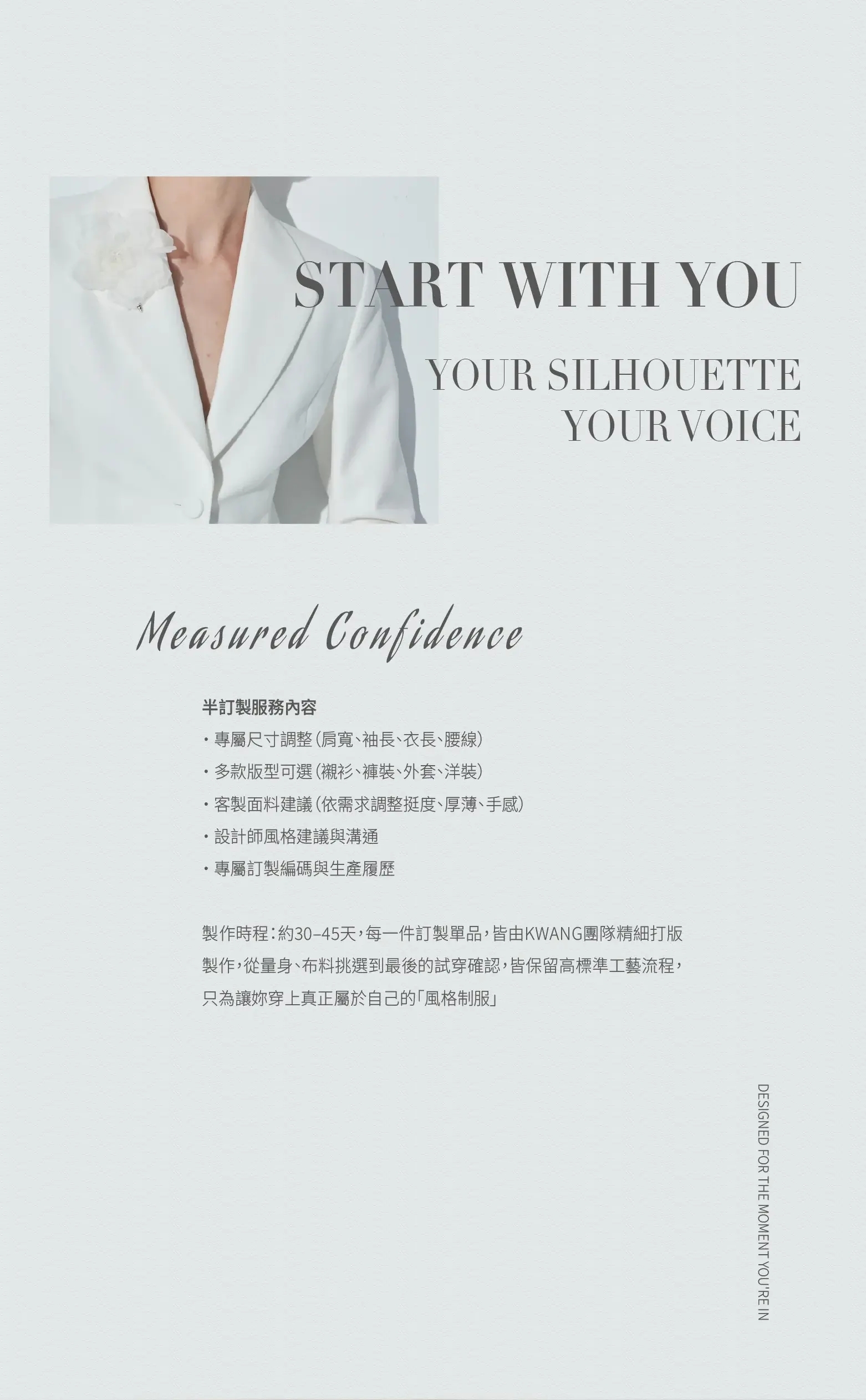 製作時程:約30-45天,每一件訂製單品,皆由KWANG團隊精細打版製作,從量身、布料挑選到最後的試穿確認,皆保留高標準工藝流程,只為讓妳穿上真正屬於自己的「風格制服」